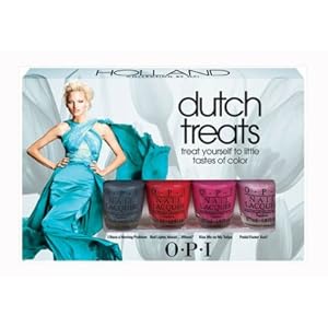 Dutch Treats is the newest set of minis from OPI's Holland Collection! Treat yourself to little tastes of colour this spring with the Dutch Treats Mini Collection. These beautiful shades are a "must have" addition to your OPI collection. The set contains 3.75ml - 1/8 Fl.Oz. bottles of: I Have A Herring Problem - A shimmering sea green shade infused with gold and silver glitter. Red Lights Ahead...Where? - A stunning red crème with coral undertones. Kiss Me On My Tulips - A shocking hot pink with a crème finish. Pedal Faster Suzi! - A lavender toned pink loaded with silver shimmer.